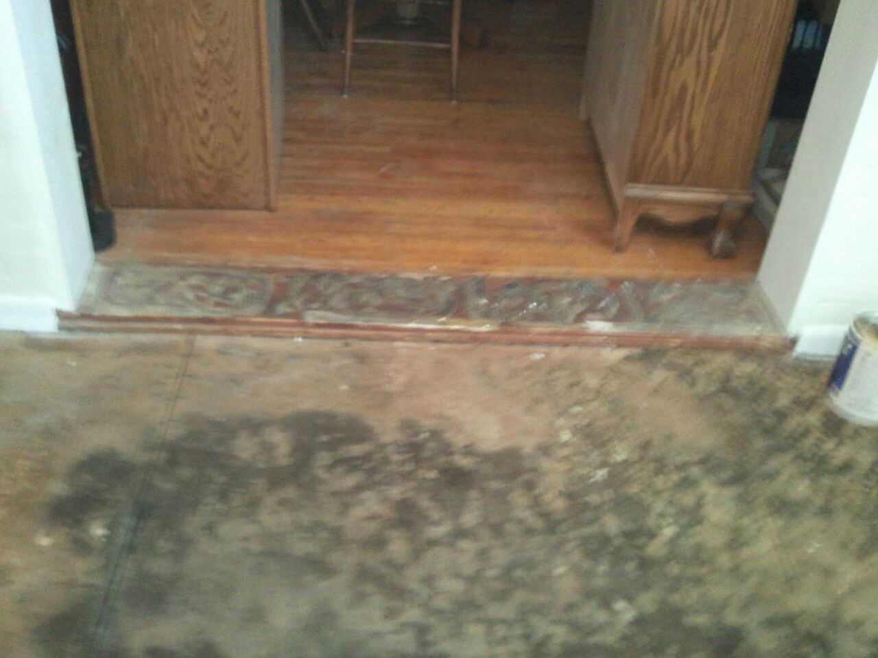 We pulled up the covering and we proceeded to make things right. We scraped up the blackened wood sub floor and scraped the floors and prepped the uneven areas.